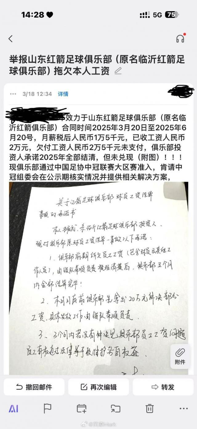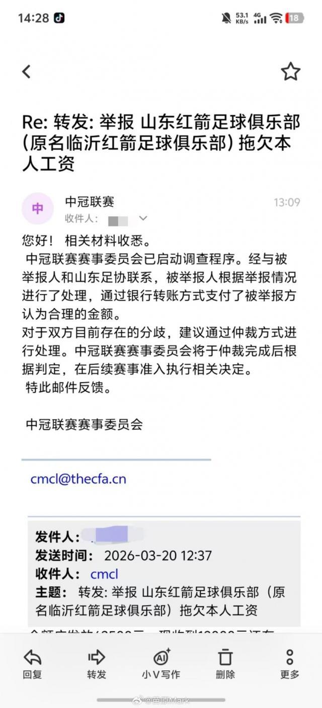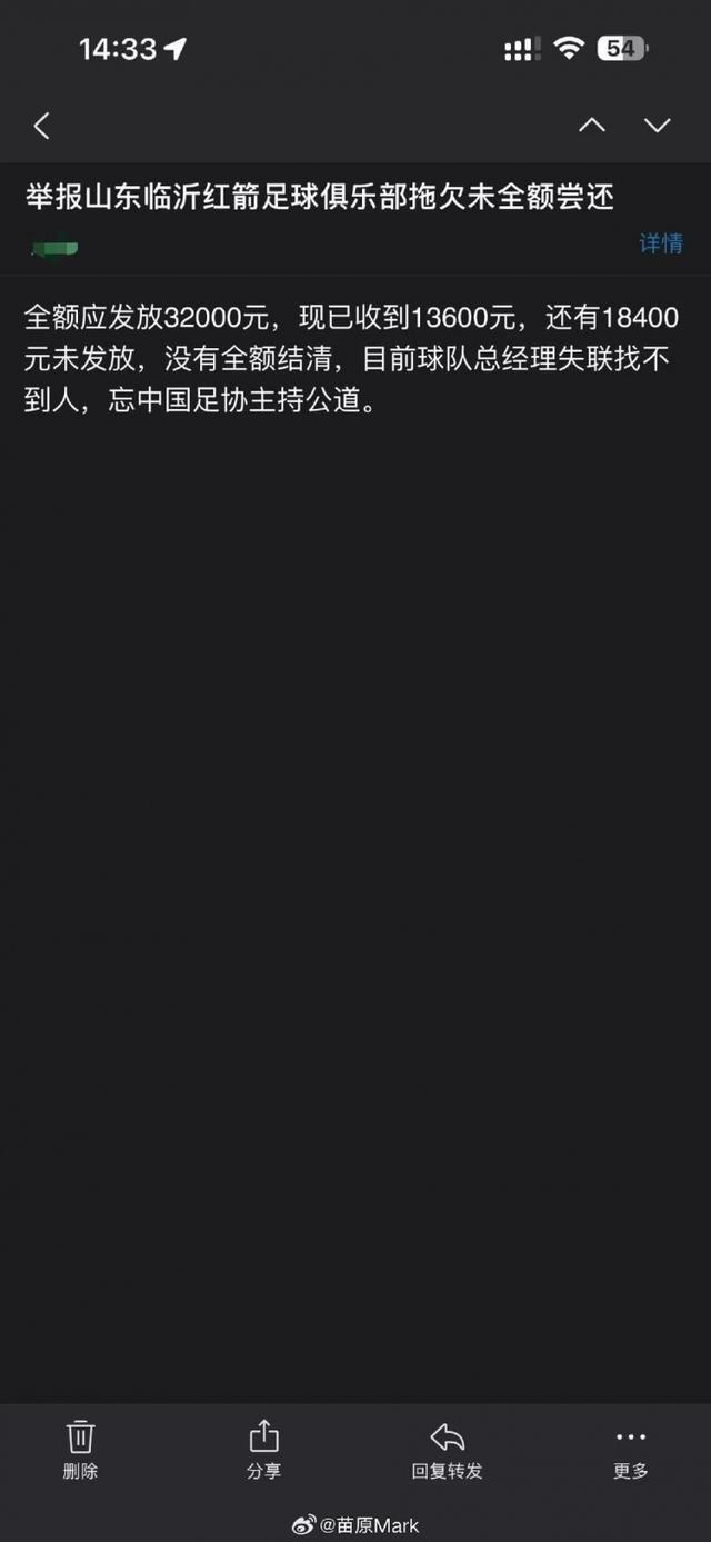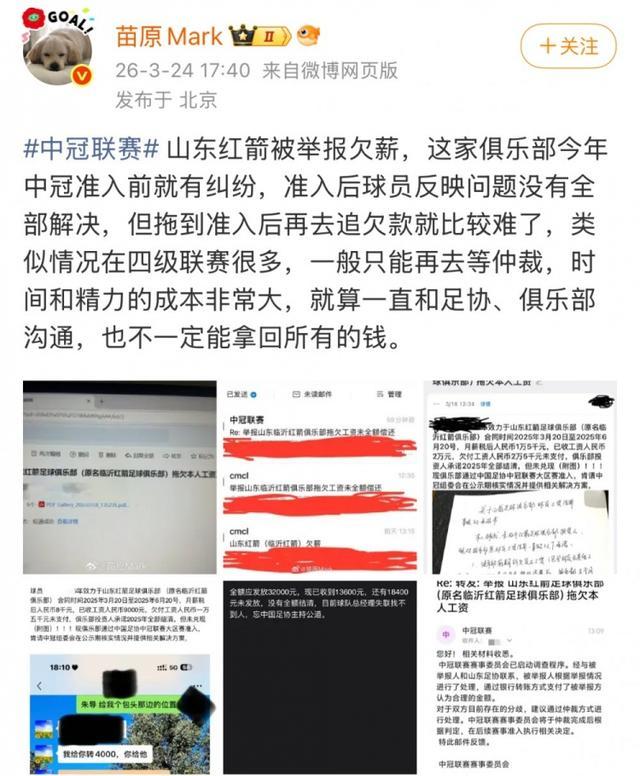 苗原在社媒晒出了多张反映山东红箭欠薪的投诉信截图以及中冠官方的回复,并配文写道: